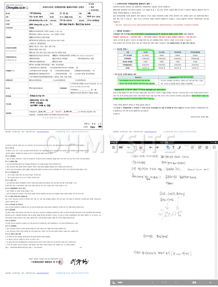 마지막장에는 계약서가 있어 계약서 내용을 안내 드리고 서명을 받습니다.