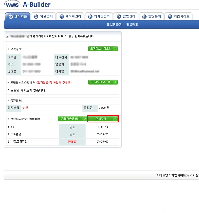 3.관리자모드를 클릭하면 아래의 화면이 나타납니다. 아래의 화면에서 작업지시 버튼을 클릭합니다.