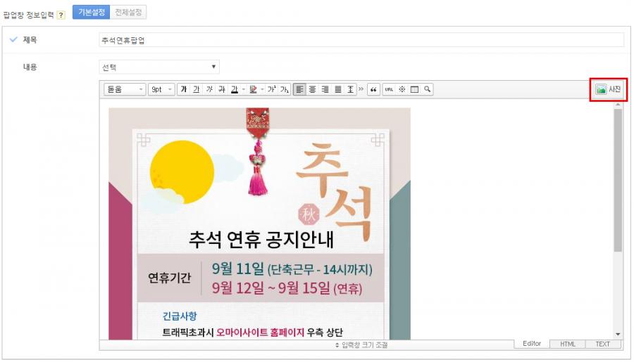 이미지 첨부를 하고, 이미지의 사이즈와 팝업 노출기간, PC와 모바일노출 등을 체크 후