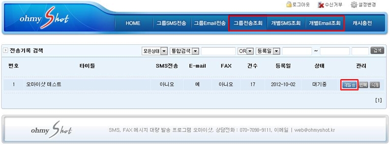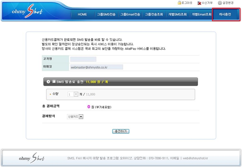SMS를 보내려면 캐쉬를 충전(만원단위)해야 합니다. (오마이사이트 계좌로 입금 or 카드결제)