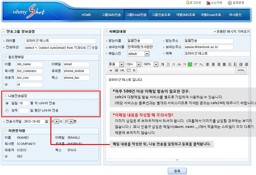 이메일 전송은 하루에 500통까지 보낼 수 있습니다. 하지만, 동시전송이 최대 10통까지 되기 때문에