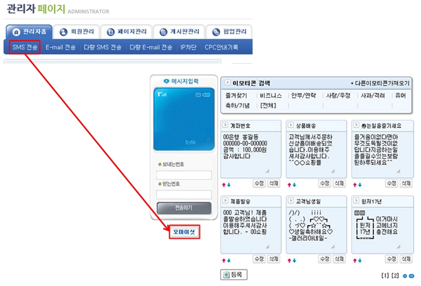 (1) 관리자 모드 > 관리자홈 > SMS전송
