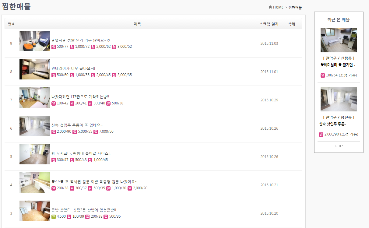 한번 검색했던 매물 중 기억에 남는 매물들을 찜하여