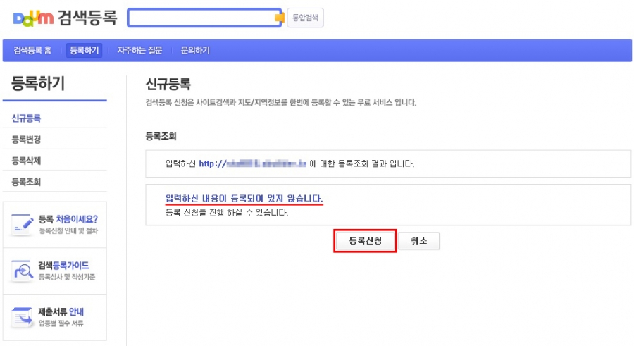 웹문서최적화 검색한 주소가 이미 등록되어 있는 주소가 아니라면 등록이 가능합니다.