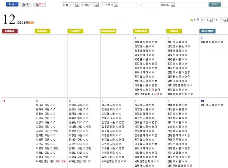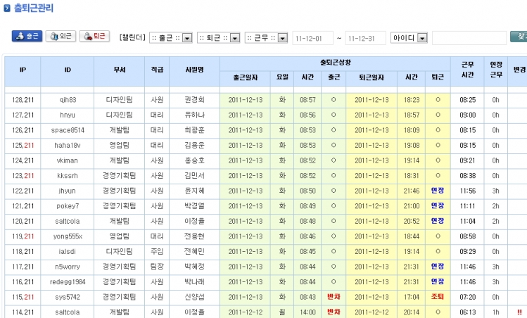 출근시간, 퇴근시간, 시간외근무, 연차, 반차 등을 관리할 수 있도록 출퇴근관리 게시판을 만들어 사용하고 있습니다. 퇴근 시 업무일지 작성 여부를 파악하여 퇴근이 가능합니다.