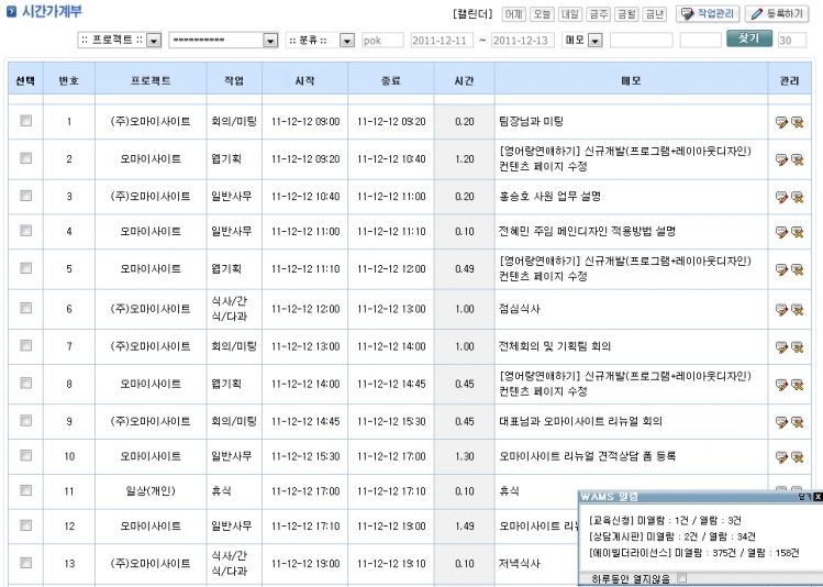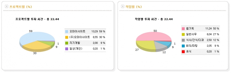 저는 시간관리 개념을 업무일지에 도입하였는데요, 보통의 업무일지의 역할에 더해 프로젝트에 소요된 시간까지 확인 할 수 있는 장점과 온라인 관리가 되는 잇점이 있습니다.