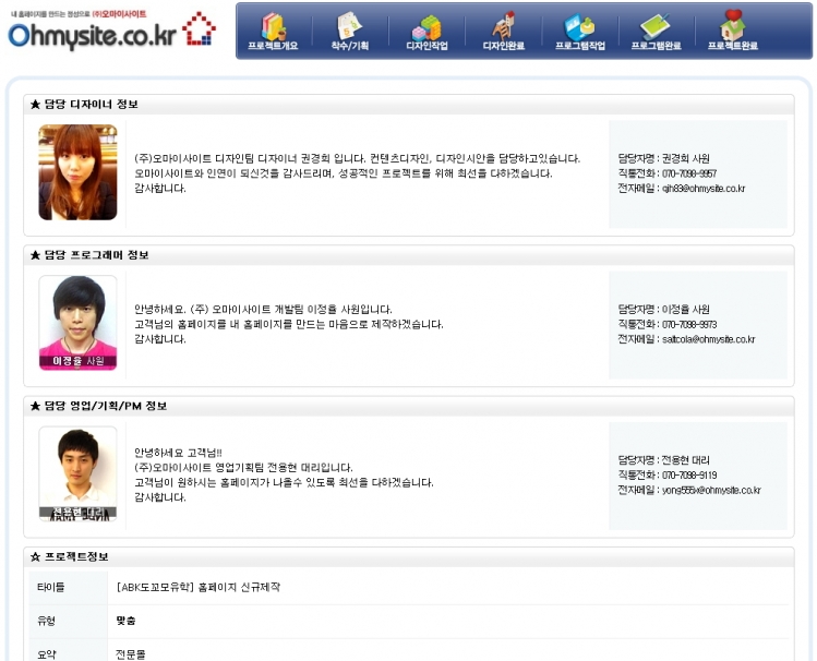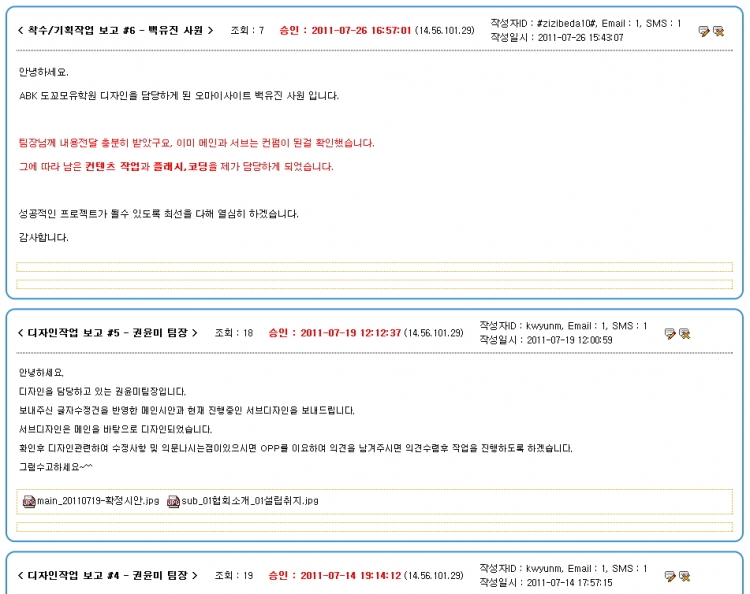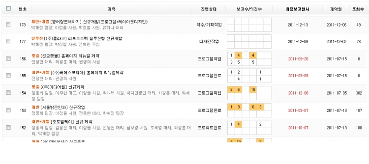 의뢰 받은 내용의 통합보관과 고객 자료, 커뮤니케이션 내용, 디자인시안컨펌 등을 시간순으로 기록 관리 할 수 있도록 덧글 기능이 조합되었습니다. 착수/기획, 디자인, 개발, 완료 단계별 보고서를 이메일로 보낼 수 있는 기능도 나중에 추가 하였습니다.