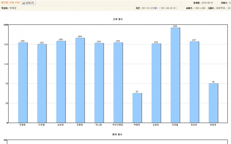 만드는 김에 사업 분야별 업무종류별 통계를 볼 수 있도록 하였고, 기간을 지정하여 검색할 수 있어 지난 몇 년간의 데이터도 쉽게 뽑아 낼 수 있습니다. (게시판 구조의 장점이죠^^)