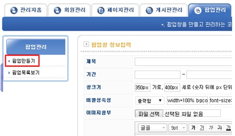 팝업작성을 클릭합니다