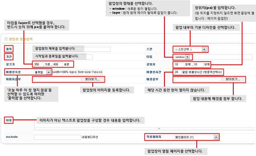 팝업창의정보를 입력하고 저장합니다