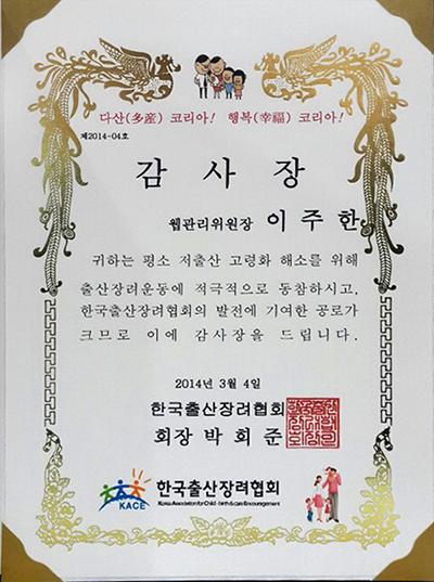 한국출산장려협회의 웹관리위원장 자격으로 감사장을 수여받았습니다.