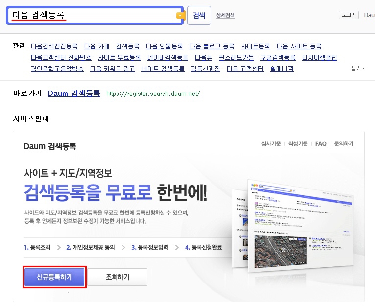 웹문서최적화 '다음 검색등록'이라고 검색을 한 후 '신규등록하기'를 클릭합니다.