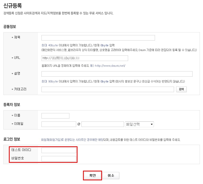 * 다음의 경우 로그인 정보를 기입하는 박스가 있습니다. 특히 쇼핑몰이나 학원 등 회원가입을 주로 하는 사이트인 경우 필수 기입 사항이며, 기입하지 않을 시 등록이 거부 될 수 있습니다. (사이트 내의 유해자료를 판단하기 위함으로 주로 임시 테스트 아이디를 생성하여 기입합니다)