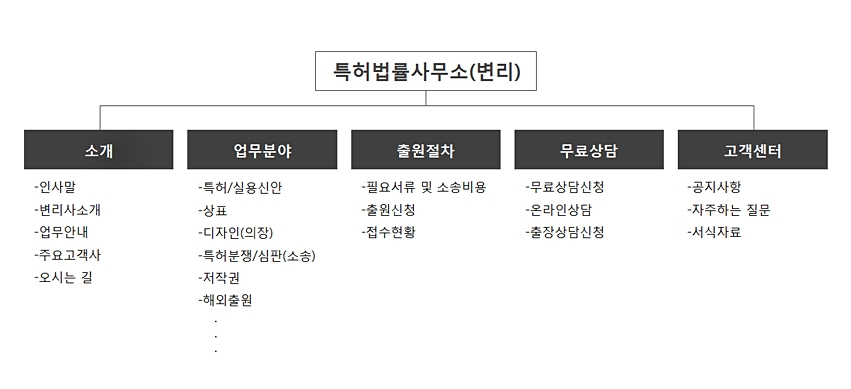 · 인사말, 변리사 소개, 업무안내, 주요고객사, 오시는 길 등
