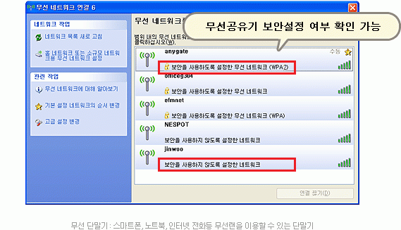 무선단말기에서 무선 네트워크를 확인해 보면 현재 이용 가능한 무선공유기와 보안설정 여부를 확인할 수 있습니다.