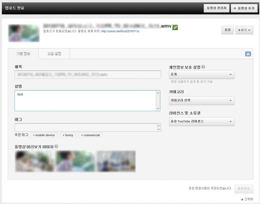 영상에 대한 간단한 정보를 입력합니다. 일정 시간이 경과하면 영상은 자동으로 업로드 됩니다.