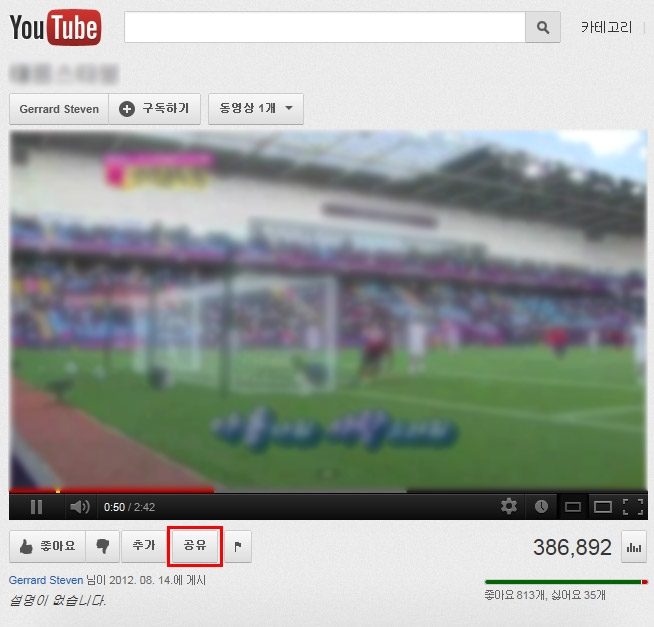 퍼가려고 하는 영상 하단에 있는 '공유' 버튼을 클릭합니다.